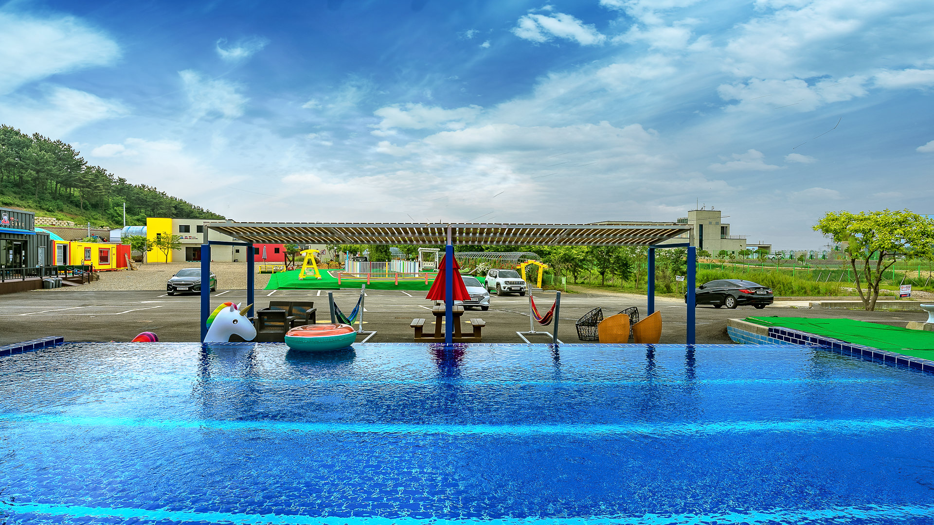 야외에서는 자동차 트랙에 굴러가는 전기기차와 야외수영장이 있어 아이들에게 호응이 좋다고 합니다.