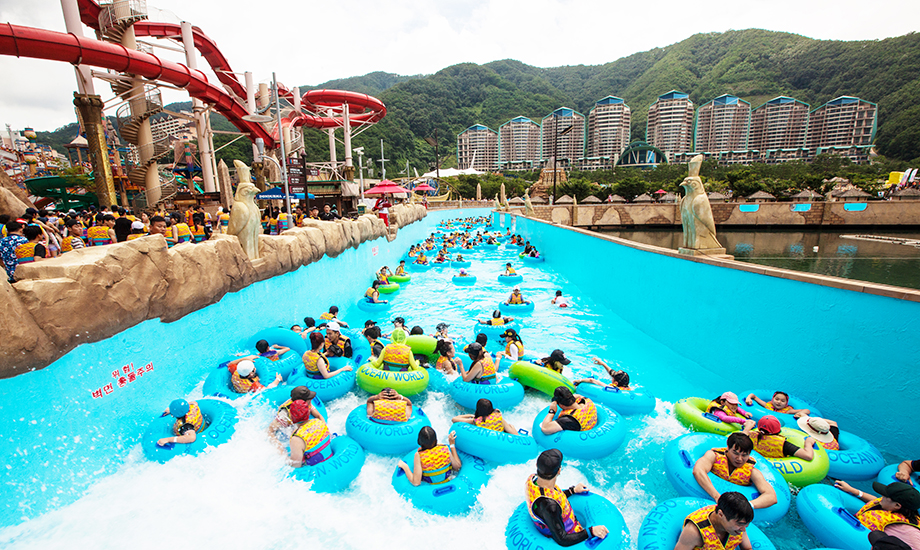 오션월드는 자연환경의 훼손을 최대한 억제한 친환경 워터파크이며, 모든 연령이 편안한 휴식과 짜릿한 즐거움을 동시에 누릴 수 있습니다. 전체 규모는 실내존 43,291㎡, 익스트림존 25,787㎡, 파도풀존 19,284㎡, 다이나믹존 31,242㎡, 메가슬라이드존 7,041㎡로 총 126,645㎡이며, 이는 축구장 14배 넓이로 동시 수용 가능인원은 2만 3천명입니다.